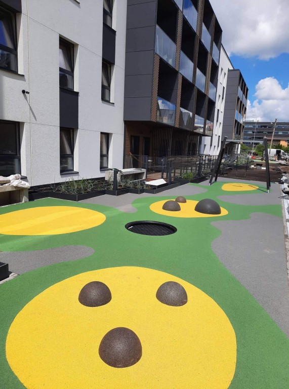 Saugus, mažai priežiūros reikalaujantis ir ilgaamžis paviršius vaikų žaidimų aikštelėms, sporto zonoms ir viešosioms erdvėms. Atspari oro sąlygoms, smūgiams bei UV spinduliams danga užtikrina komfortą, saugumą ir estetiką.