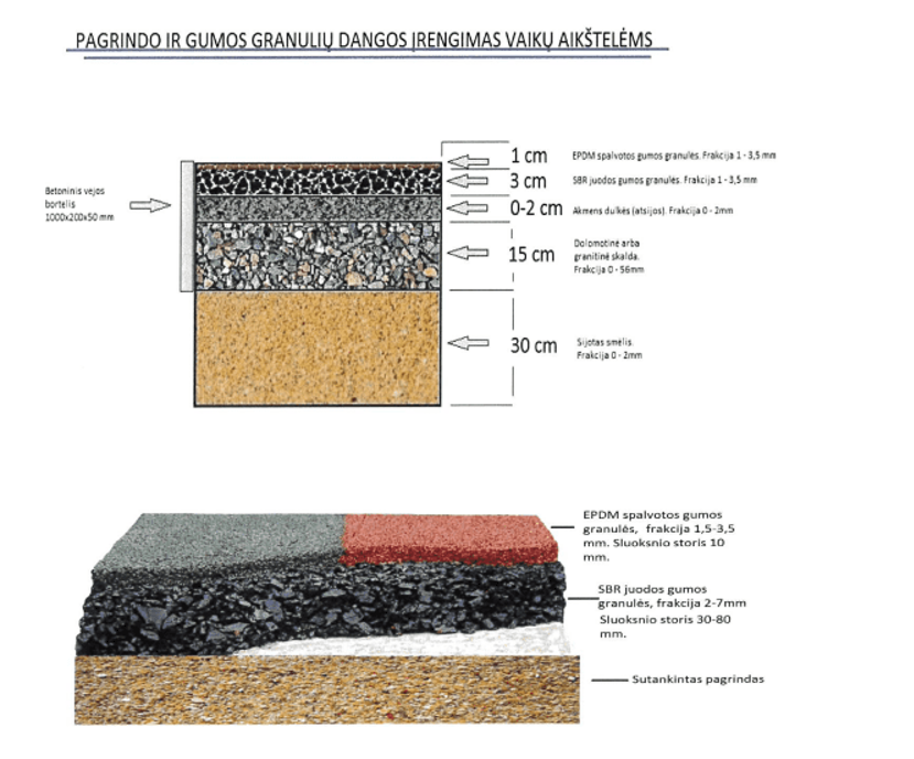 2 SBR granulės – storis priklauso nuo kritimo aukščio – 30 – 110 mm.